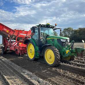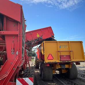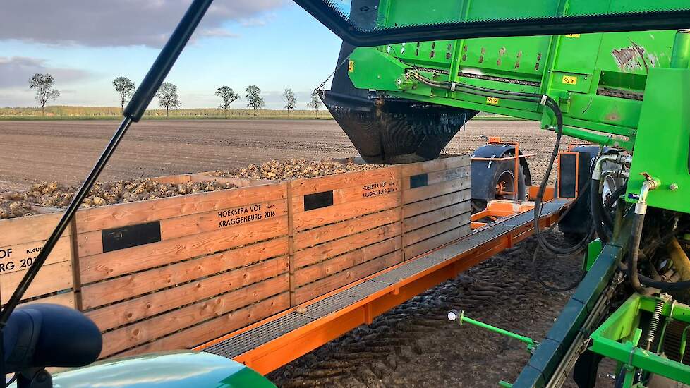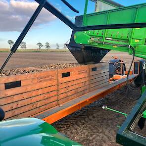 Het zetmeelareaal van De Jong beslaat dit jaar rond de 20 hectare. „We hebben nog een hectare of 15 te gaan. Dat zijn BMC’s en die gaan de schuur in.” De proefrooimonsters daarvan stemmen hem tevreden. „Ik heb er een monster bij zitten van 72 ton. Daar moet dan nog wel 20 procent vanaf, maar dan kom je alsnog uit op opbrengsten tussen de 55 en 60 ton. Ik ga eerst uit van 50 ton en dan ben ik dik tevreden. Het onderwatergewicht varieert tussen de 510 en 560 gram. Dat is hartstikke goed.” Maar we moeten ze natuurlijk nog wel rooien.” Als alles volgens planning verloopt, gaat De Jong dit weekend of begin volgende week weer rooien. „Toen we dit seizoen begonnen met rooien, waren de omstandigheden redelijk, maar al snel werd het behoorlijk droog. De aardappelen rolden toen bijna uit de rug.” Gelukkig kregen we in de eerste weken van september regen. De rooiomstandigheden nu kunnen eigenlijk niet beter.” Hij verwacht dat over een dikke week alles gerooid moet zijn. „Dan komen traditiegetrouw de oliebollen op tafel. We kunnen ook mooi op tijd beginnen met sorteren en zijn we rond de kerst klaar.”