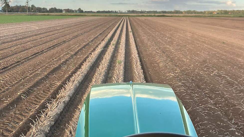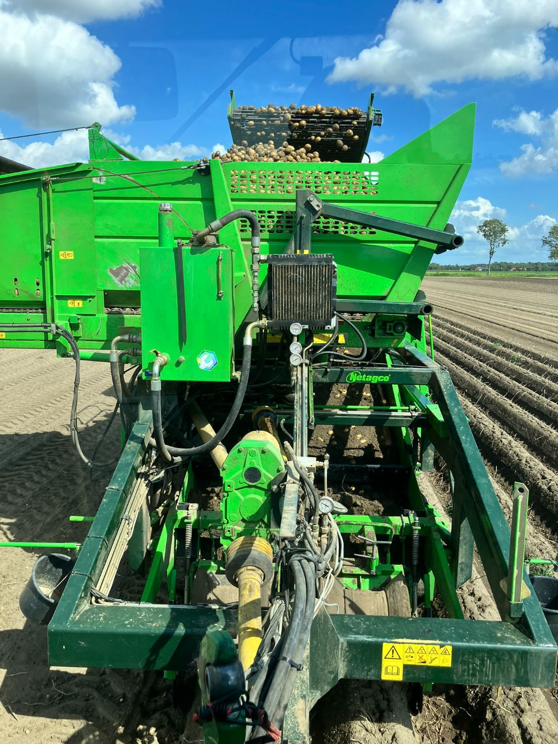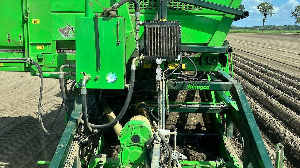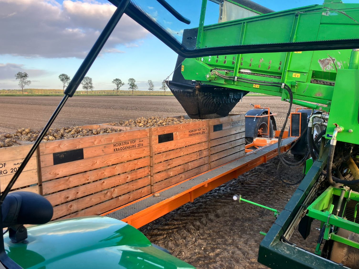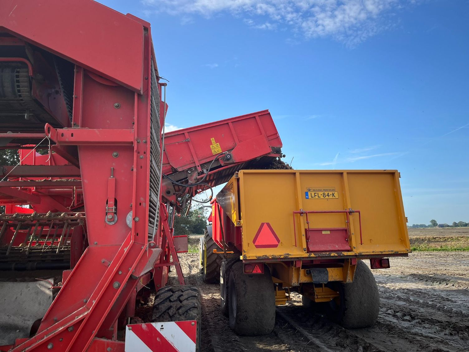 Stefan Hoekstra van landbouwbedrijf Hoekstra vof uit Kraggenburg (FL) haalt de aardappelen binnen met een getrokken Netagco AVR-bunkerrooier. Het afgelopen jaar heeft het akkerbouwbedrijf de machine als gebruikt gekocht. „Deze rooier hebben we aangeschaft zodat de kippers op de kopakker kunnen blijven. Ook onder droge omstandigheden zijn de kippersporen altijd weer terug te vinden”, legt Hoekstra uit. Het akkerbouwbedrijf uit de Noordoostpolder teelt zo’n dertien hectare pootaardappelen voor Agrico. Het gaat onder meer om de rassen Fontane, Paradiso, Arsenal, Sinora en Lugano. „De oogst is goed verlopen. We zien een goede opbrengst, maar de maatsortering is wel een stuk grover dan vorig jaar.” De akkerbouwers hebben een gedeelte van de aardappelpercelen voor de oogst met twaalf millimeter beregend, omdat het te droog was. „Een deel hebben we na twintig millimeter regen tussen de buien door gerooid. We zagen dat na de regen het wel mooier rooide dan na de haspel.” De pootaardappelen gaan in de eigen kisten-bewaring. De stammen worden rechtstreeks in de kisten gerooid.