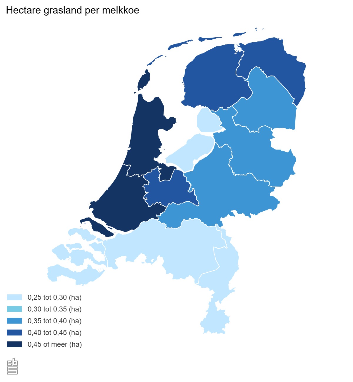 In Noord-Holland is de meeste ruimte beschikbaar, met 0,49 hectare grasland per melkkoe. Zuid-Holland komt op de tweede plaats met 0,45 hectare. Dit zijn ook de twee provincies waar koeien het vaakst in de wei lopen. In Noord-Brabant heeft een melkveebedrijf gemiddeld 0,25 hectare grasland per melkkoe, het laagste van alle provincies. Flevoland komt op de tweede plaats met 0,26 hectare.