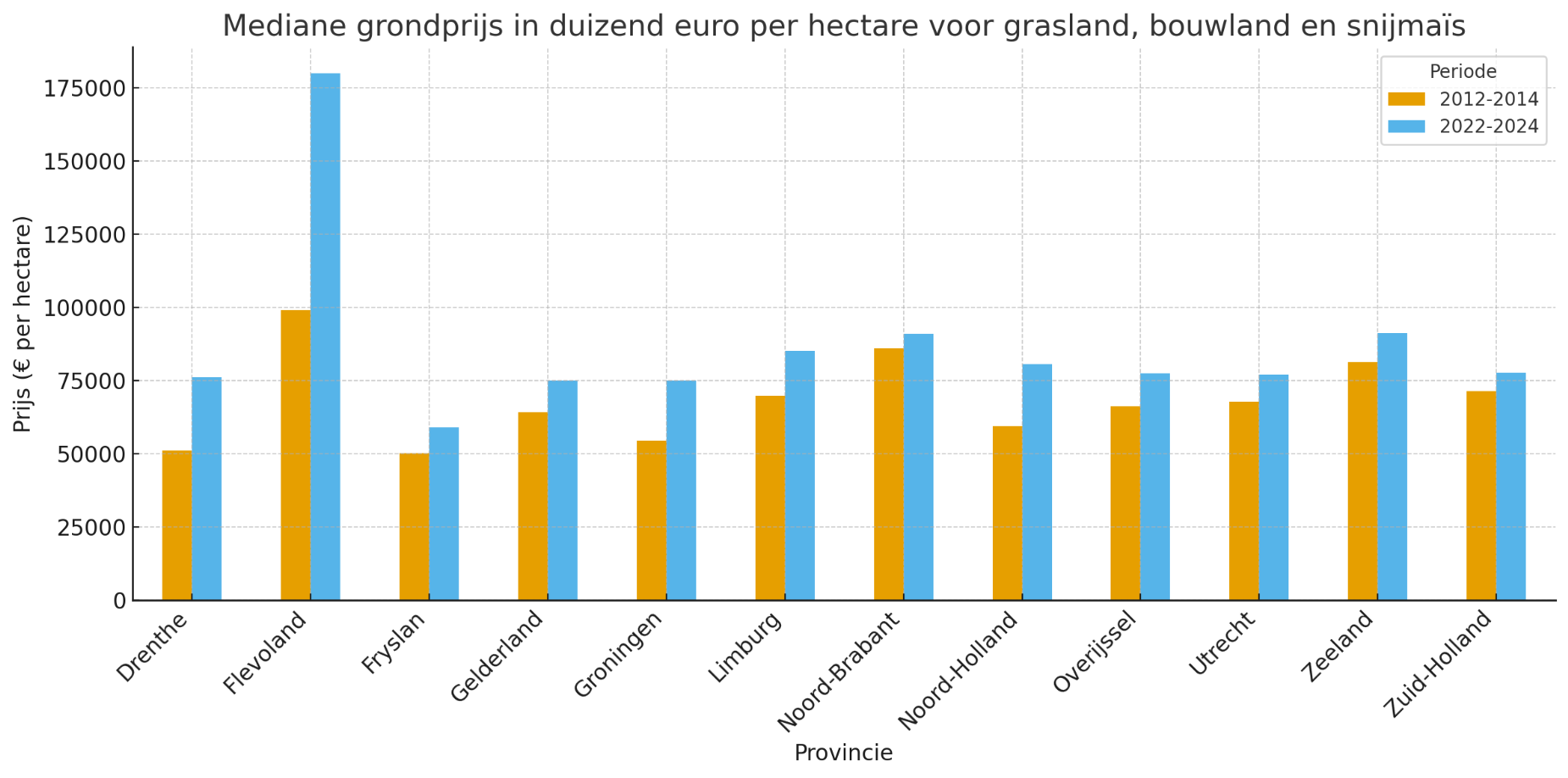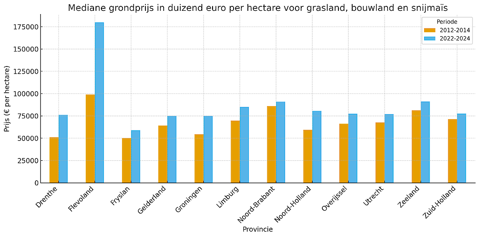 De spreiding in prijzen is vooral zichtbaar tussen provincies. In Flevoland was de variatie tien jaar geleden nog beperkt, maar inmiddels is zowel de prijs als de spreiding sterk gestegen. De mediane grondprijs in deze provincie ging van ruim 99.000 euro per hectare in 2012–2014 naar 180.000 euro in 2022–2024.
