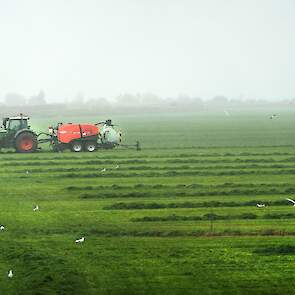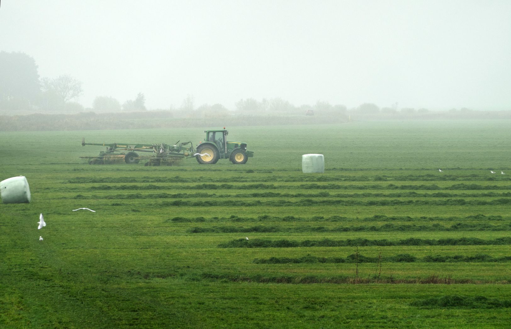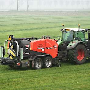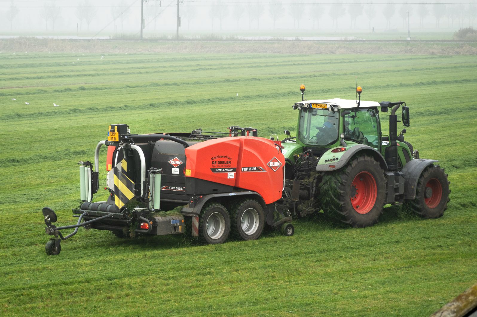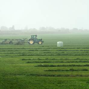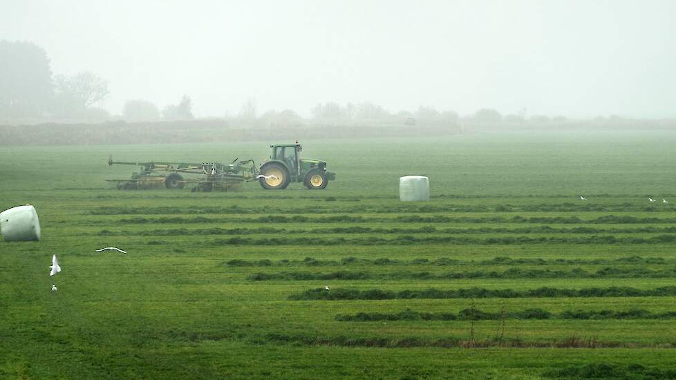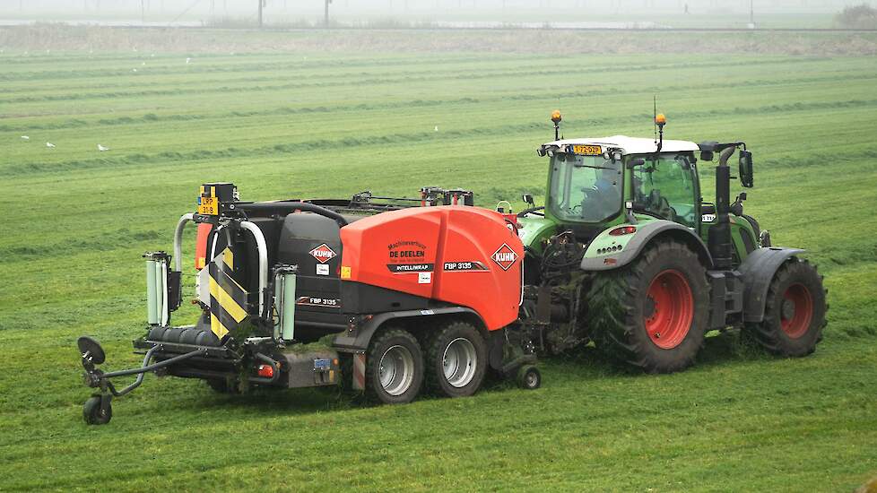 Het kletsnatte gras werd in ronde balen gewikkeld en in de loop van de middag van het land gehaald. Die balen zijn volgens Greijdanus uitzonderlijk zwaar. „Normaal weegt zo’n baal zo’n achthonderd kilo, maar met al dat water erin schieten ze over de duizend kilo.’’