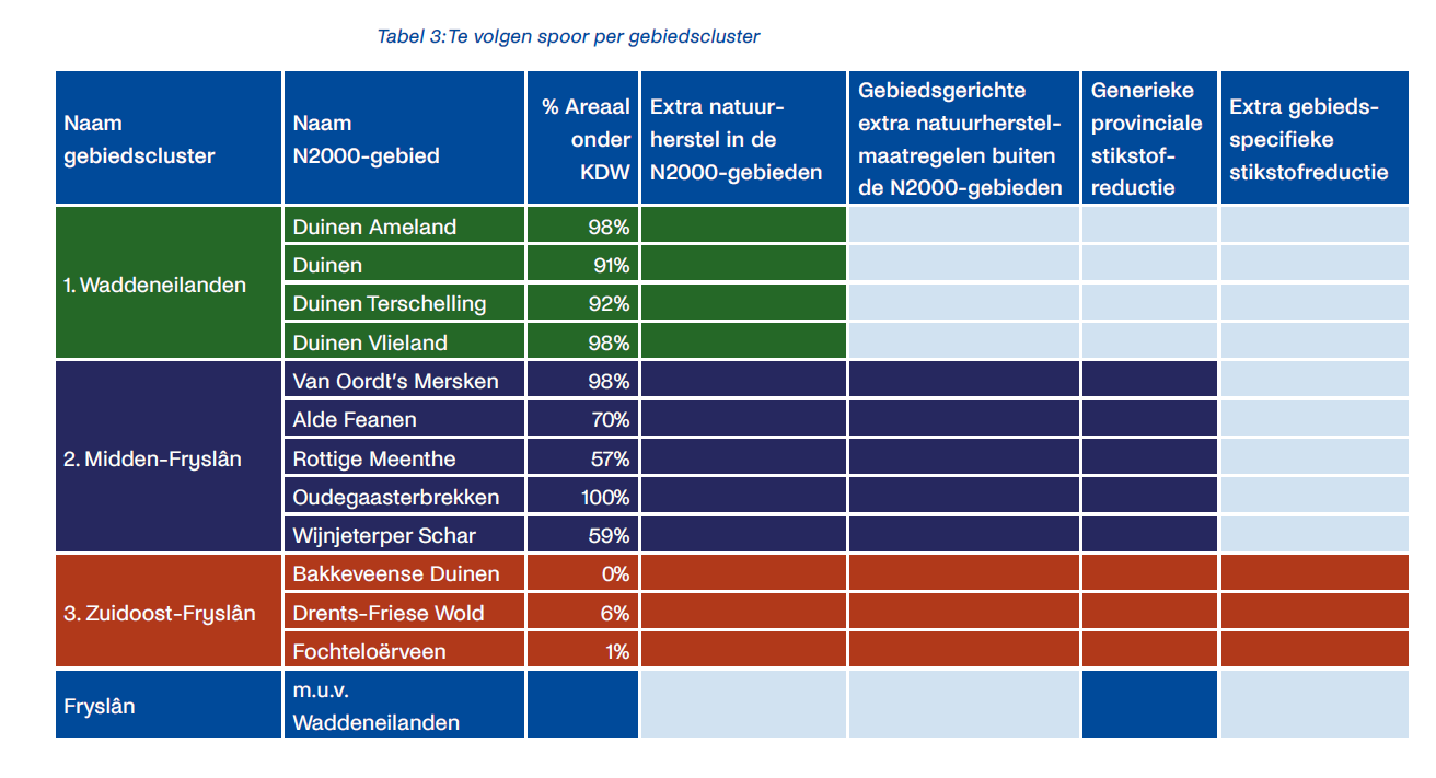 Gedeputeerde Staten van Friesland deelt de provincie op in drie gebiedsclusters: Waddeneilanden, Midden Fryslân en Zuidoost Fryslân. De provincie schrijft: ‘Voor ieder gebied maken we een aanpak voor de stikstofgevoelige Natura 2000-gebieden. Dat doen we samen met de ondernemers in de gebieden en de gemeenten, buurprovincies en het Wetterskip. Waar mogelijk sluiten we aan bij lopende gebiedsprocessen.’