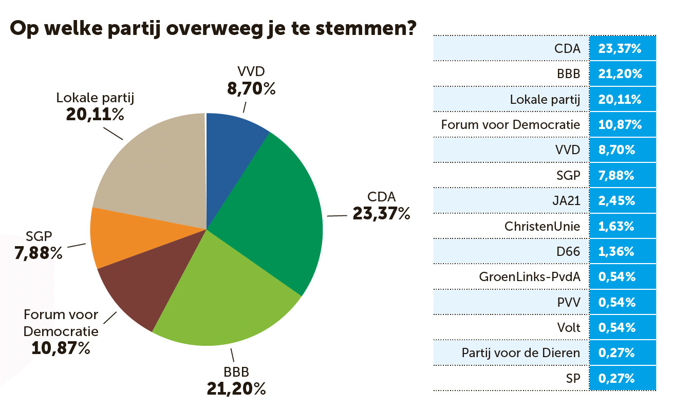 De redactie van Agrio voerde in aanloop naar de verkiezingen onderzoek uit. Uit de enquête die door 360 respondenten is ingevuld, komt het CDA naar voren als favoriete boerenpartij. Ruim 23 procent geeft aan op de nieuwe regeringspartij te gaan stemmen. Vlak daarachter komt de BBB met 21 procent. Ook lokale partijen zijn populair. 20 procent gaat dat hokje tijdens de gemeenteraadsverkiezingen op 18 maart rood maken. Op straatlengte afstand komen Forum voor Democratie (11 procent), VVD (9 procent), SGP (8 procent) en andere partijen.